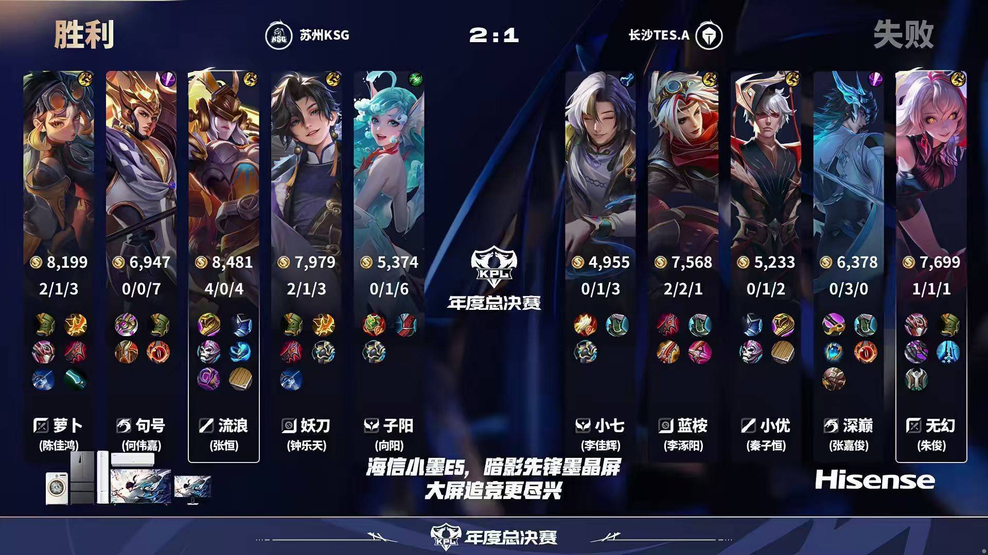 最后一局KSG虽然赢了但是很离谱,早早就领先了六七千经济,也推掉了三路高地。但推水晶时子阳开团着急了,只有句号能跟,伤害不够,反而是妖刀没人保被深巅切死了,句号位置太深也被蚩奼击杀,TES一波零换二守了下来。